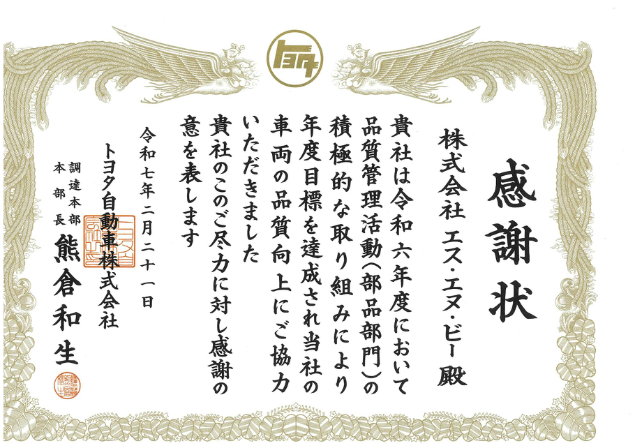 2025年03月04日(火) 品質管理活動取組みの感謝状 2025年2月21日、トヨタ自動車株式会社様より、弊社の品質管理活動において 年度目標を達成し感謝状をいただきました。 今後もより一層の努力を重ねてまいります。
